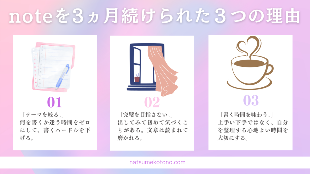 note記事「文章力ゼロの私が、週1ペースでnoteを3ヵ月続けられた『3つの理由』を元に、要点を1枚にまとめた図解です。読者の視点誘導と、複雑な思考の「翻訳」を意識してデザインしました。